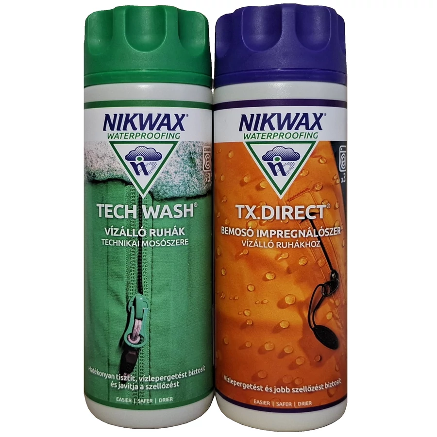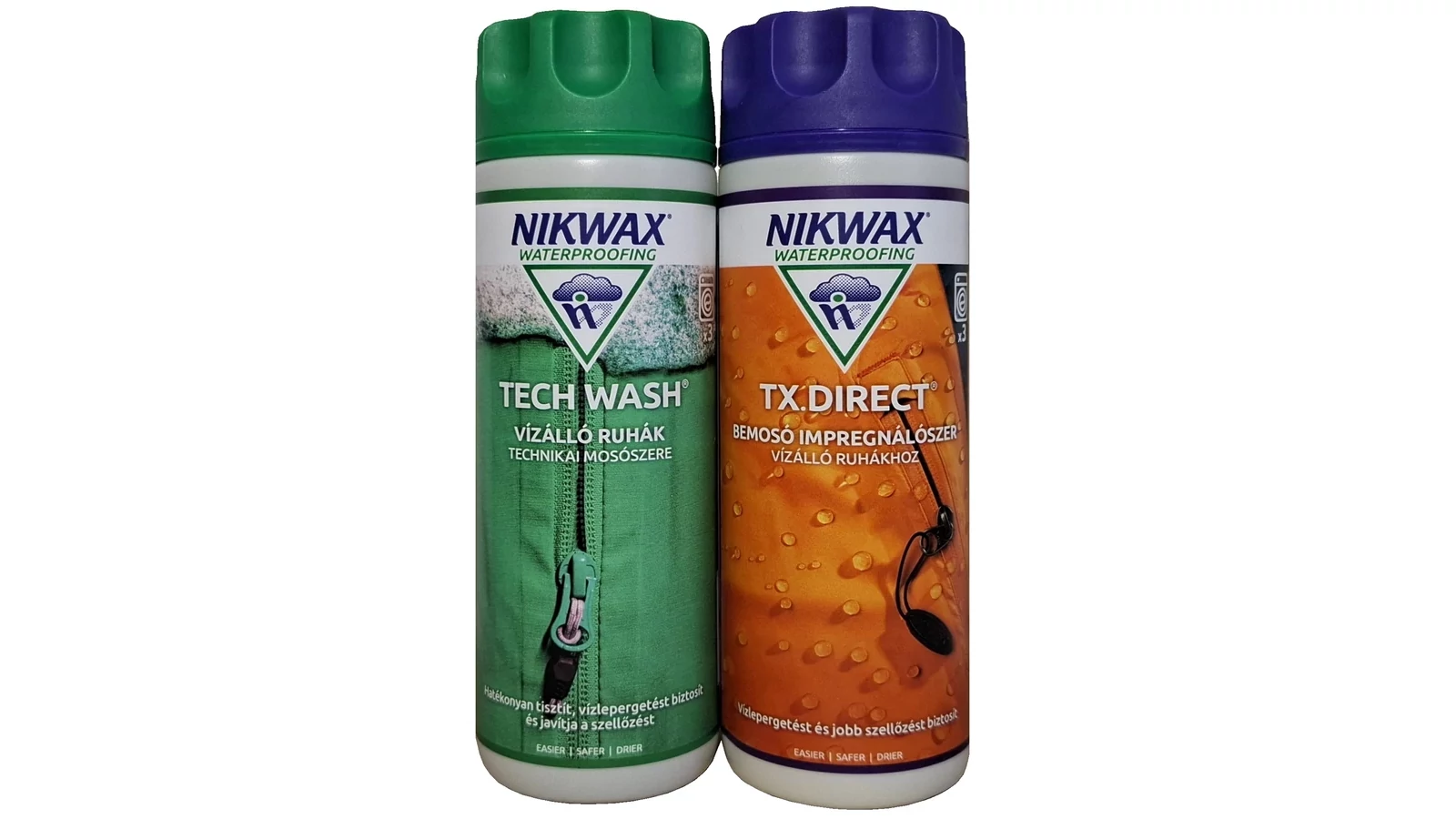 Technikai mosó és impregnáló duopack, a Nikwax Tech Wash kíméletesen és hatékonyan tisztítja a vízálló ruházatot a Nikwax TX.Direct Wash in pedig újra vízlepergetővé varázsolja a ruhadarabot. Mindezt környezetkímélő módon.