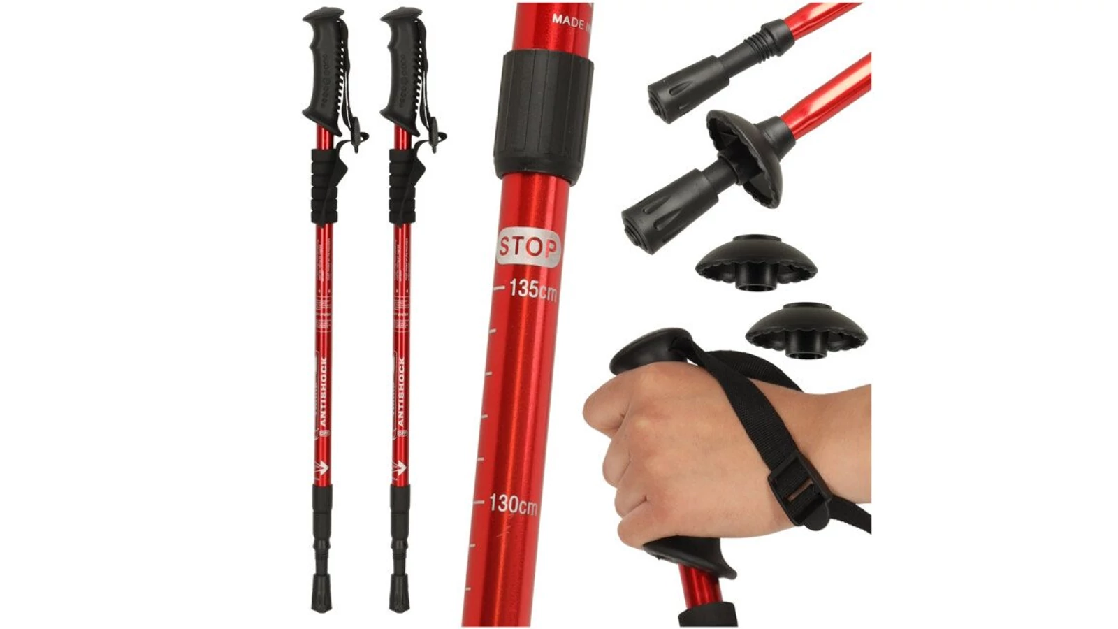 - Multifunkciós végek – a végkészlet (gumi rátétek és nyílások) lehetővé teszi a botok használatát különböző körülmények között: aszfalton, sárban, homokban vagy hóban.